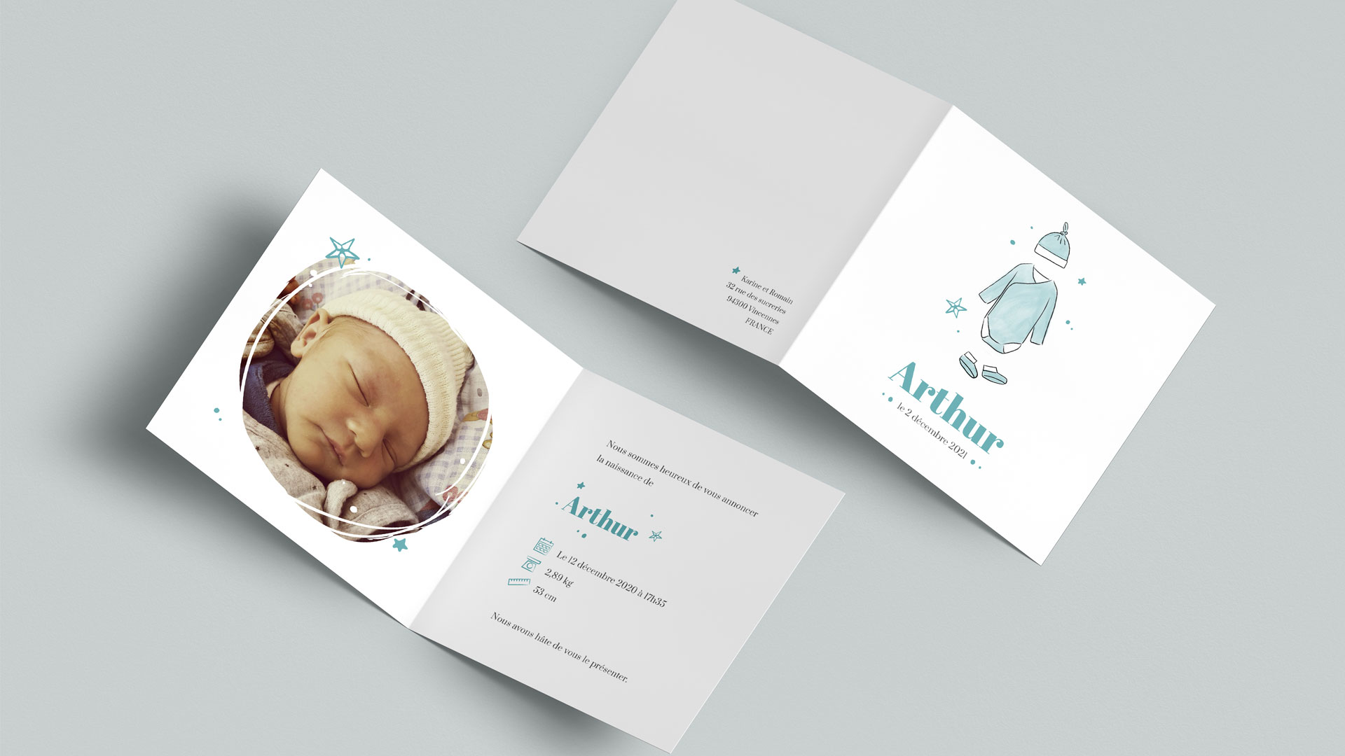 Conception graphique et illustration d'un faire-part pour annoncer la venue du bébé.
